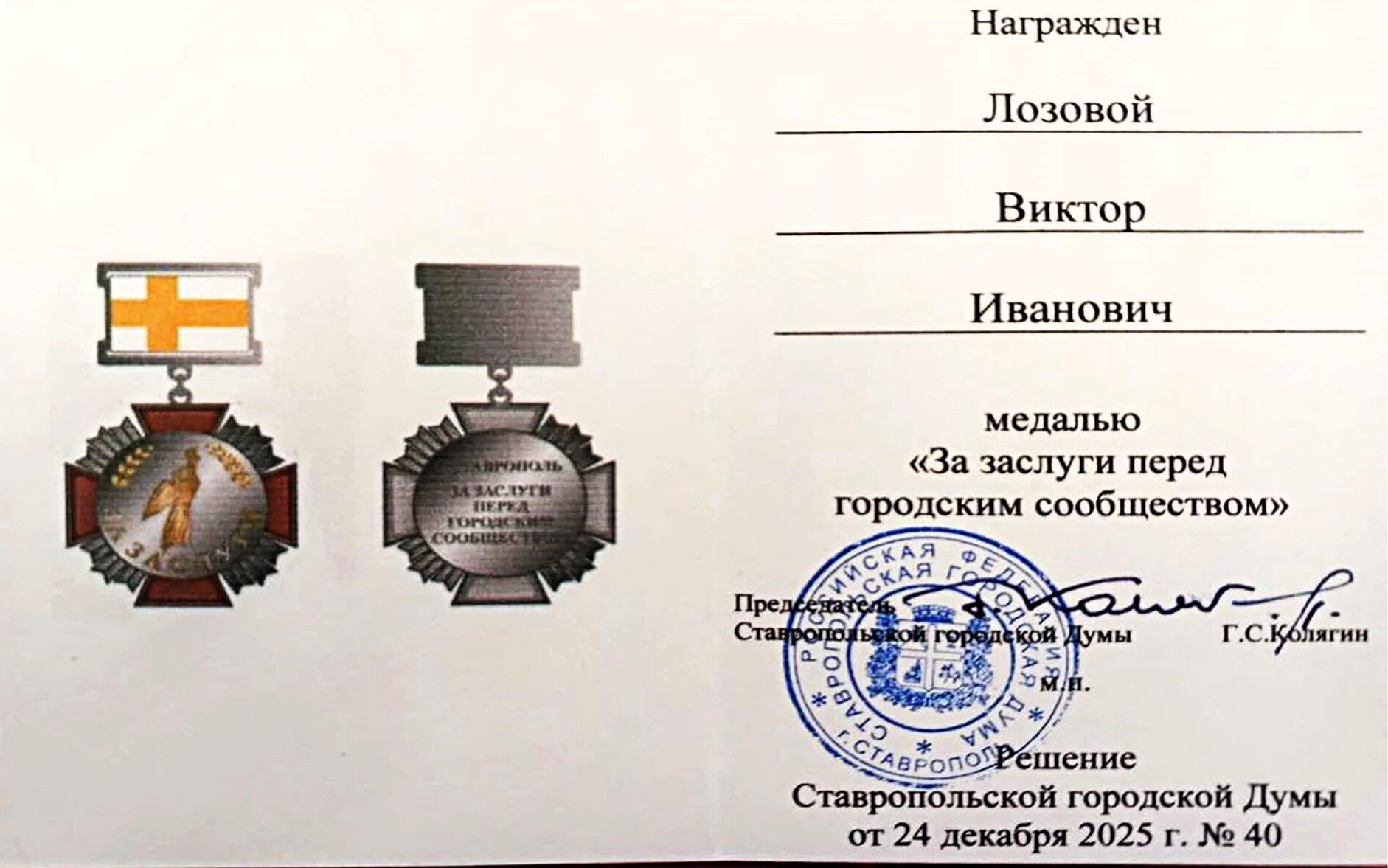 24 декабря 2025 года решением Ставропольской городской Думы председатель Ставропольского краевого регионального отделения «Российского Совета ветеранов пограничной службы», депутат Думы Ставропольского края Виктор Иванович Лозовой удостоен медали «За заслуги перед городским сообществом.