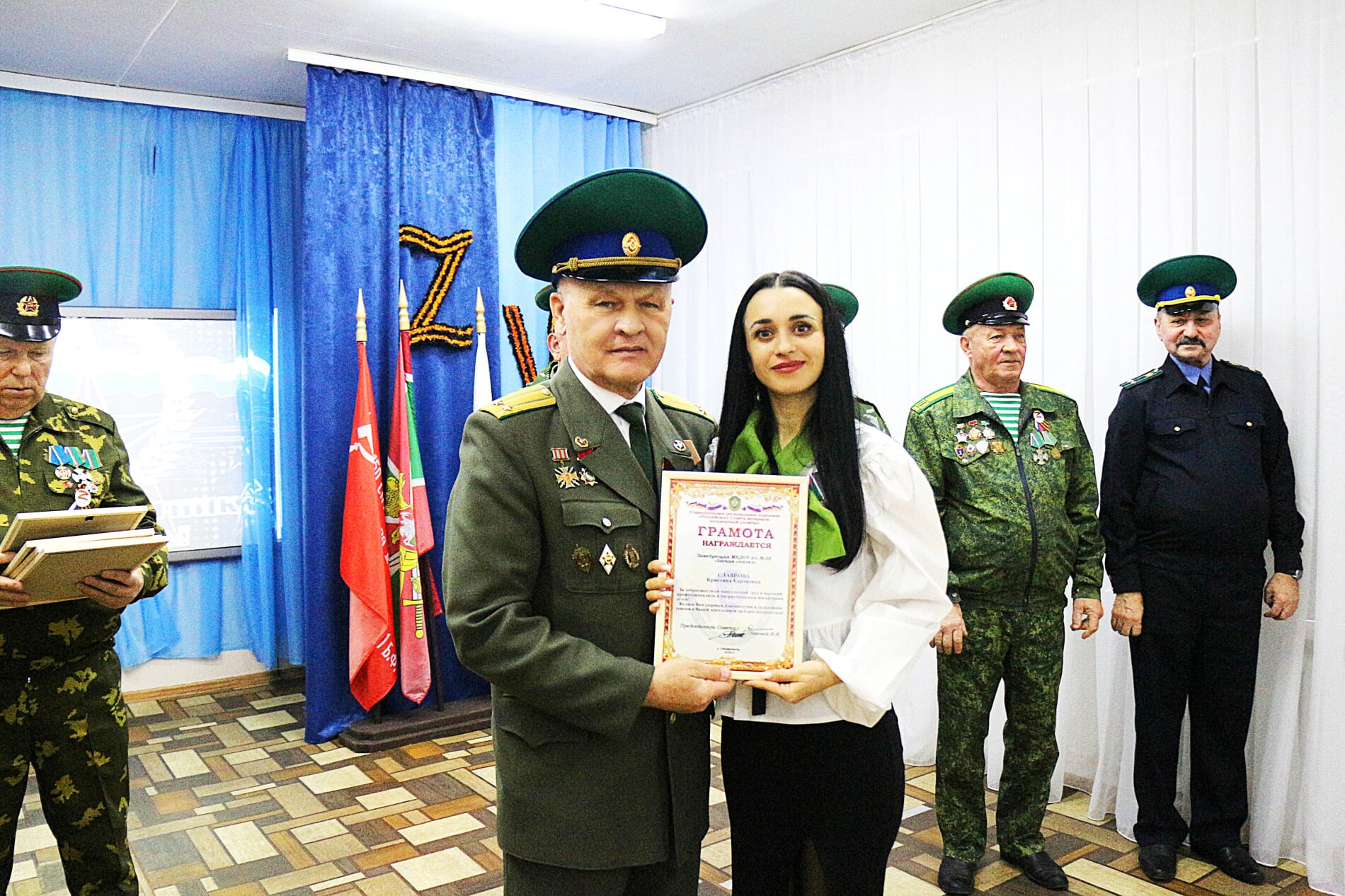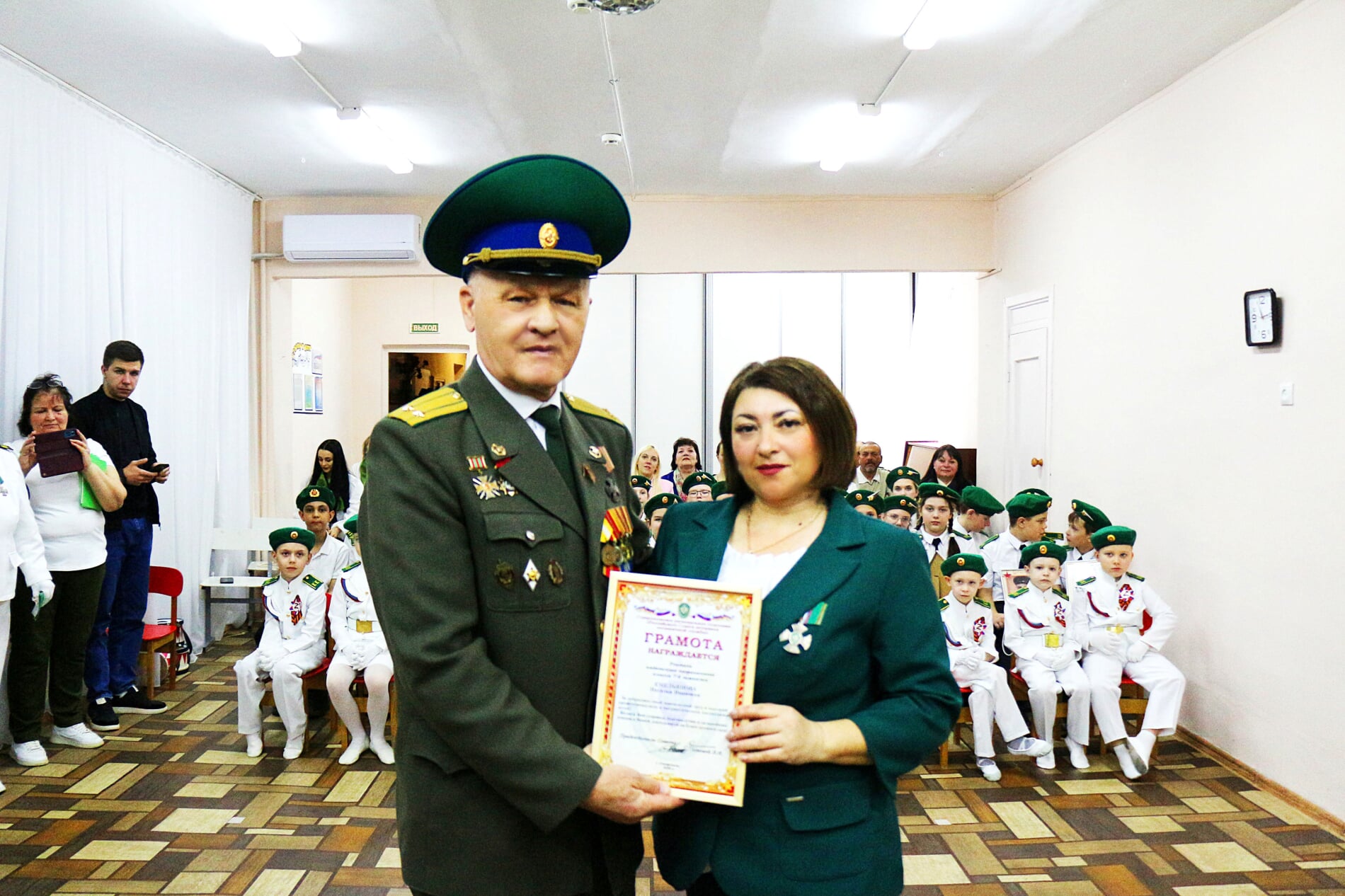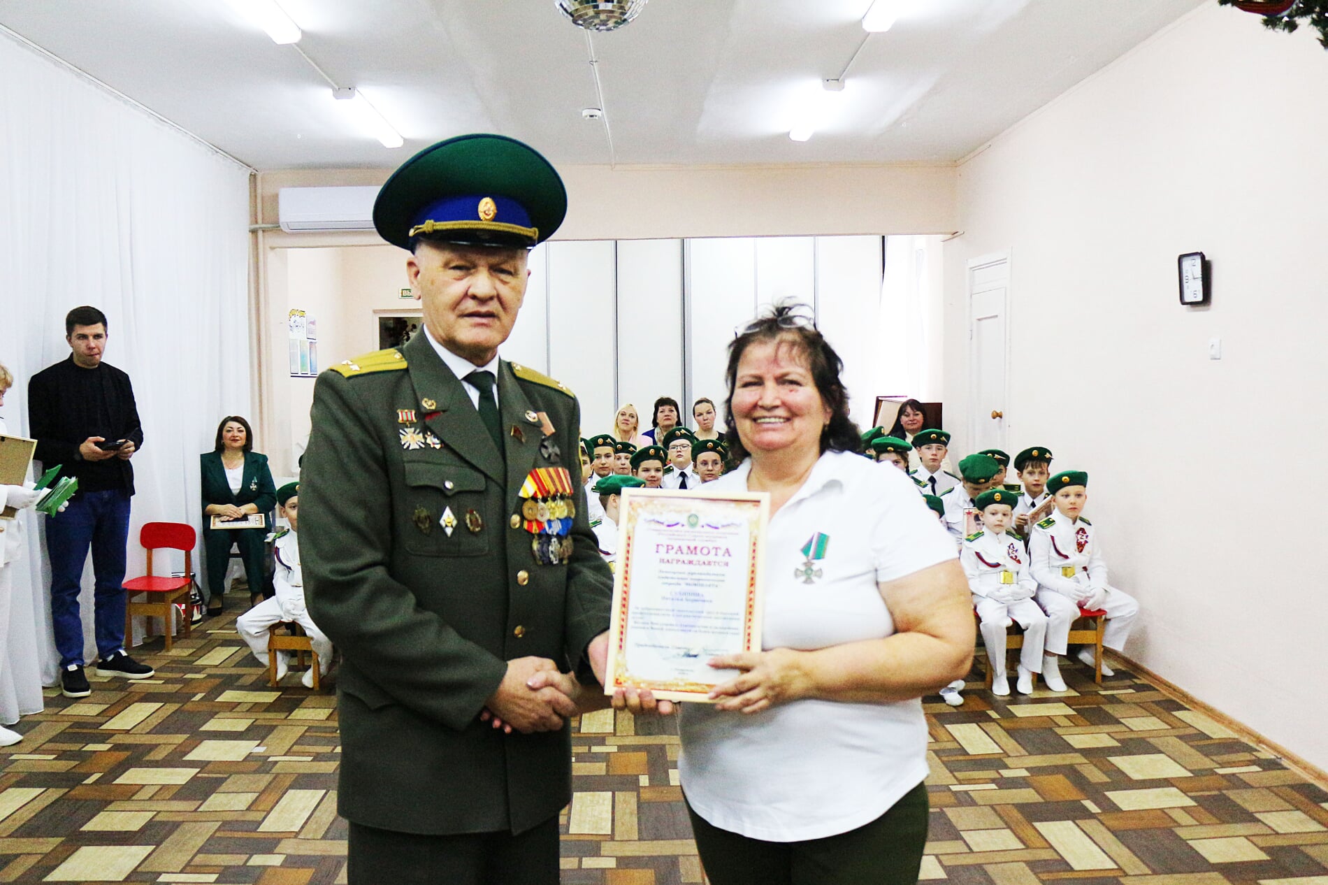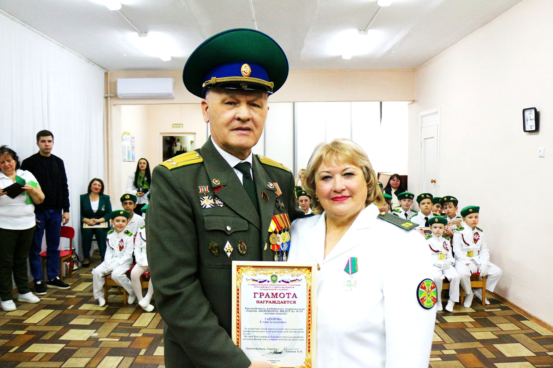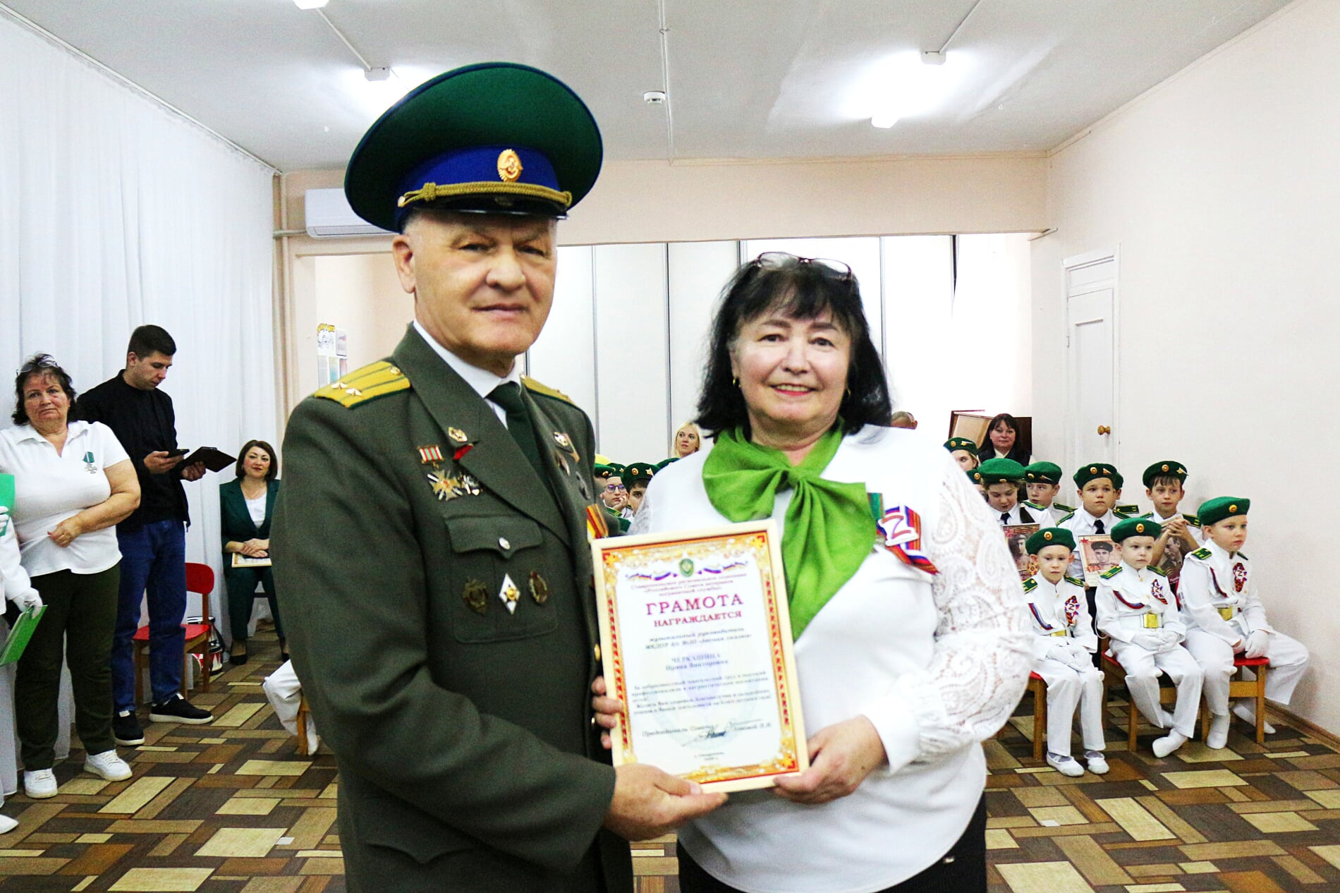 За добросовестный и многолетний труд, а также высокий профессионализм в патриотическом воспитании детей Виктор Иванович поощрил заведующую детским садом Кристину Славнову, коллектив дошкольного учреждения и классного руководителя пограничного отряда «Альфа» 7-й гимназии Наталью Емельянову Благодарственными письмами.